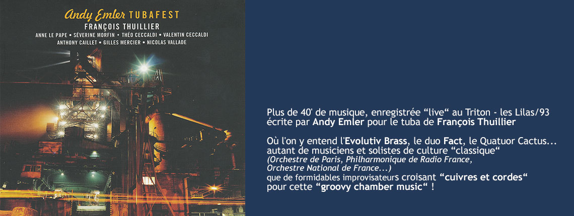 Enregistré en live au Triton en octobre 2014, Tubafest réunit des compositions d’Andy Emler pour cuivres et cordes en l’honneur du tubiste François Thuillier. Une nouvelle exploration du pianiste – compositeur – chef d’orchestre, qui multiplie depuis plus de vingt-cinq ans les rencontres incongrues.